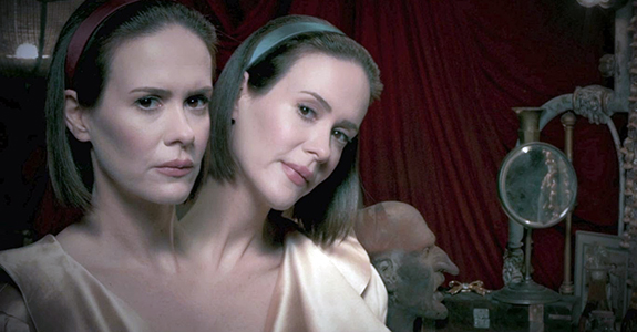 After a handful of teasers, it looks like American Horror Story: Freak Show (premiering on FX on October 8th) is going for the big reveal with its characters! The first extended trailer, called “Voyeur,” was released yesterday, and it features the members of the freak show, including two-headed Sarah Paulson, three-boobed Angela Bassett, bearded Kathy Bates, strong Michael Chiklis, horny Evan Peters, and German Jessica Lange.