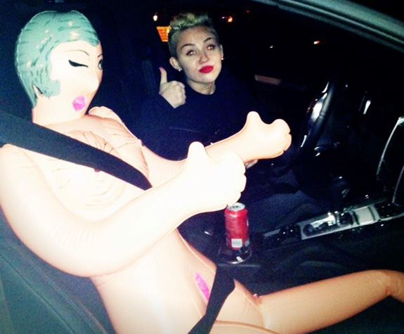 Happy day after Xmas, everyone! Hopefully, you all had a happy holiday, and even if you don’t celebrate Xmas, we hope you still had a nice little day off. Anyway, no matter how good you think your Xmas was, Miley Cyrus clearly beat all of us because bitch got herself a blow-up sex doll for a present. WERK. Then she took it for a drive around the block with her, because everyone knows when you get a sex doll, you have to show it around the hood. “Oh what’s that? You got some new shoes for Xmas? Well I got a sex doll for Xmas, and we were about to go through a drive-through. Eat it.”