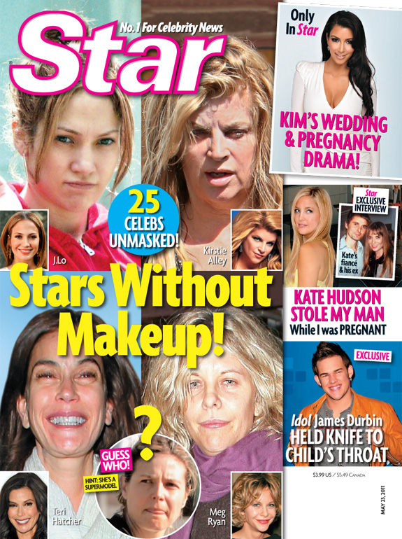 What would we do without Star magazine’s Stars Without Makeup feature they run every few months? This probably sells more issues at the grocery store than all the Brangelina and Jennifer Aniston rumors combined! We can always use a light-hearted dose of ‘celebrities, they’re just like us’ reminders! This time we’ve got Jennifer Lopez, Kirstie Alley (who has been kicking ass on Dancing With The Stars, I hope she wins!), Teri Hatcher, and Meg Ryan on the cover, and the guess who is Heidi Klum (that was an easy one). The magazine should try to find more current pictures, they’re all fairly old, especially the one of J. Lo! Besides celebs sans makeup, there’s gossip on Kim Kardashian, Kate Hudson, and American Idol contestant James Durbin, who feels like a total Adam Lambert rip-off. Don’t get me started on this season of Idol, I have nothing nice to say, I just can’t wait for it all to be over in about three weeks!